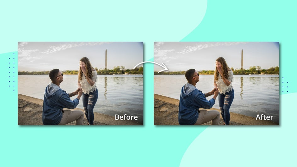 If you're looking to give your engagement photos a quick touch-up, try using the A.I. Portrait Enhancer. This tool not only balances your photos as a whole – but it also helps soften your skin's texture and brightens key features. Your photos will come out with better contrast and balance without oversaturating the image.