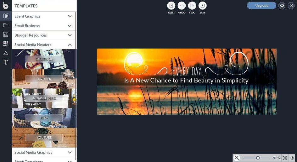 The Graphic Designer has a wide range of social media templates, including for each platform. What’s most exciting, however, is the fact that you can resize any template to your required dimensions. This means you can quickly and easily turn a Facebook post image you created into one that’s perfectly resized for sharing on Twitter, Instagram, or Pinterest too. This will save you so much time!