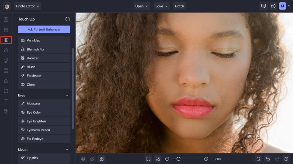 The Touch Up menu also acts as a photographer’s best friend, as it’s filled with digital makeup tools to enhance a subject’s natural beauty, as well as everything you need to reduce blemishes, eradicate fine lines, even out skin tone, whiten teeth, and more. The Touch Up menu is also home to an Artificial Intelligence-powered Portrait Enhancer that'll retouch your photos in a single click.
