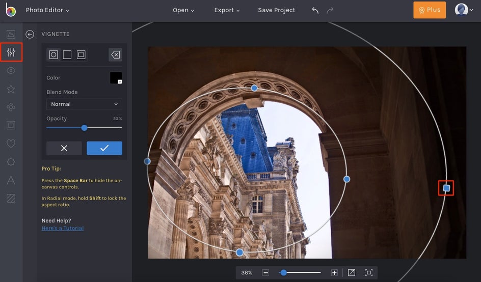 To use one, click on Vignette in the Edit menu and select either the Radial, Square, or Linear tab. Most vignettes are circular in nature, but you can get creative with the Square or Linear vignettes if you want! Drag and resize the vignette target on your image so that the focal point is in the center, then adjust the Opacity, Color, or Blend Mode from the menu.