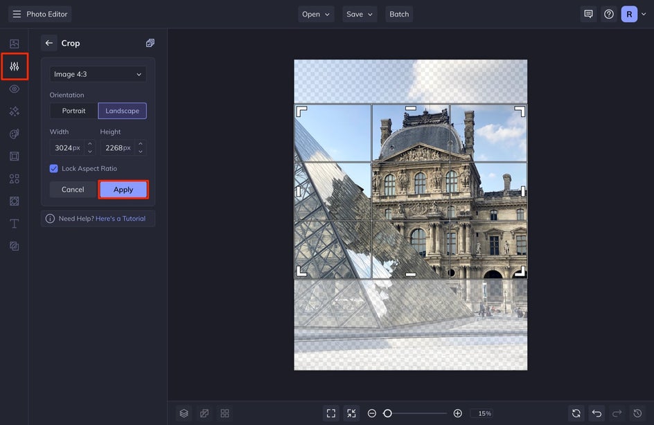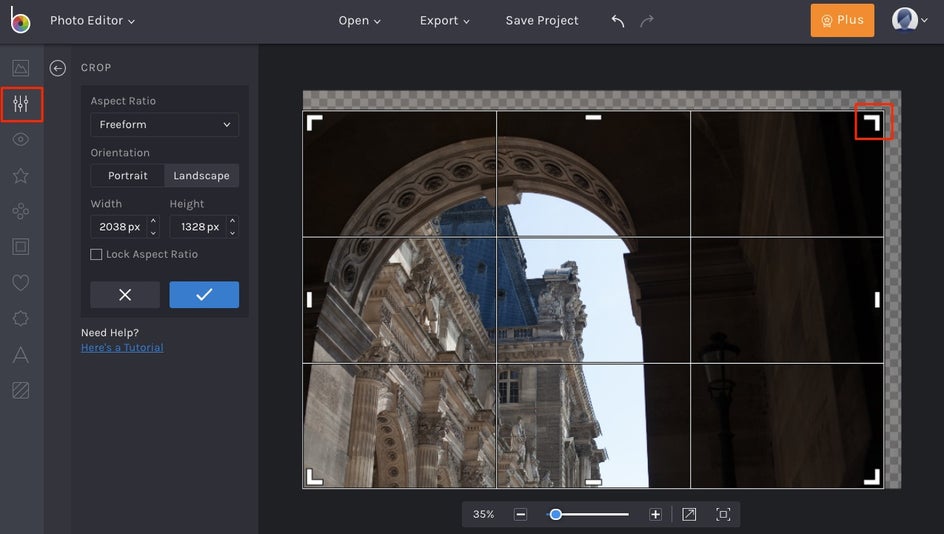 The Crop tool can help you to reposition your focal point or crop out unwanted items in your shot. After selecting it from the Edit menu, drag and resize the Crop target to fit within the area you want to highlight. Everything outside of this target will be eliminated from the photo.