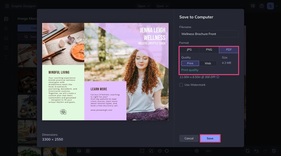 Once the front is complete, click on the Save tab to put aside your design and start customizing the back template. When you're ready to share and distribute, be sure to export your brochure as a high-resolution PDF for print or digital use.