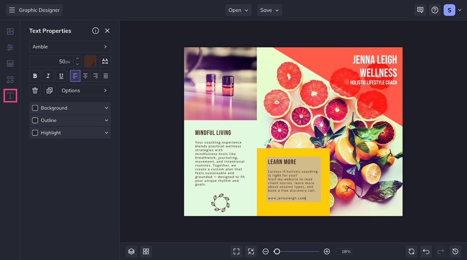 Next, personalize the layout to fit your content. Use the Text tab to add or edit text boxes for service descriptions, packages, team bios, or contact information. You can also head to the Graphics tab to swap out existing graphics or add your own from BeFunky’s built-in library.