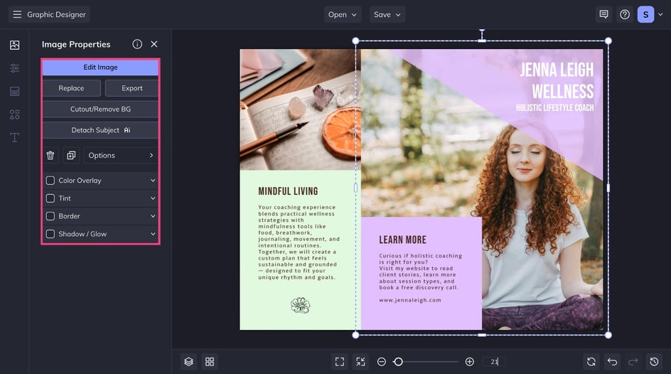 For more complex customizations, click on an image to open the Image Properties menu. From here, you can make several quick edits or open BeFunky’s Photo Editor to adjust lighting, soften tones, or enhance natural textures.