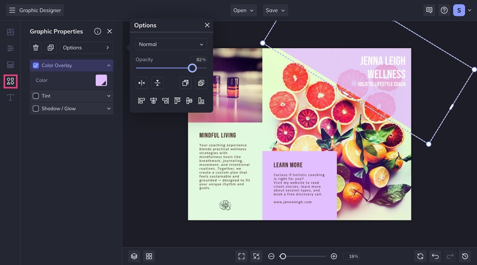 BeFunky’s drag-and-drop interface makes it easy to create a clean, intentional layout that flows naturally from panel to panel. Head to the Graphics tab to add new assets to your design and click on any design elements to open the Graphic Properties menu. From there, you can change colors, opacity, or replace shapes with your own icons.