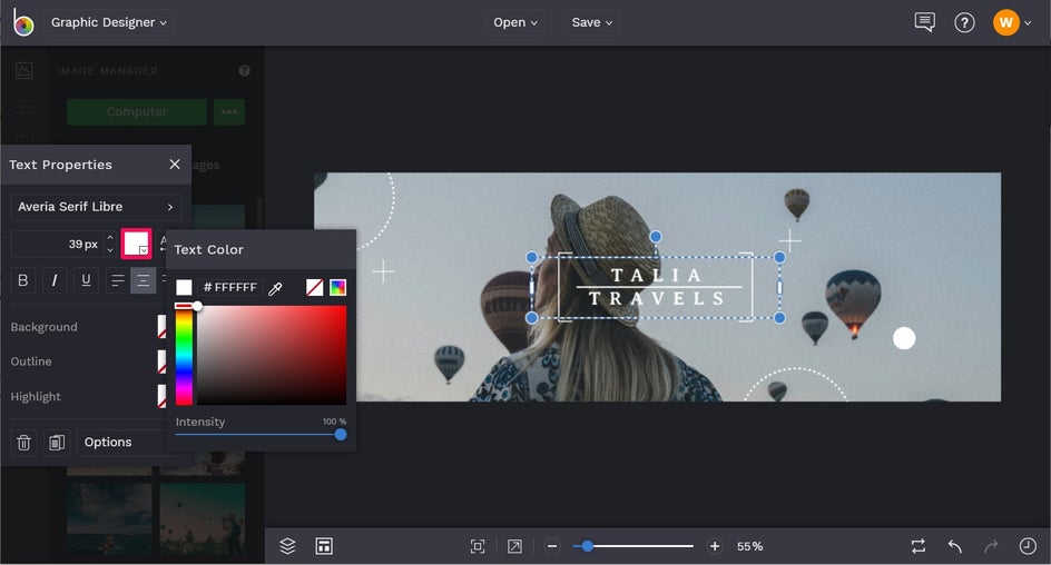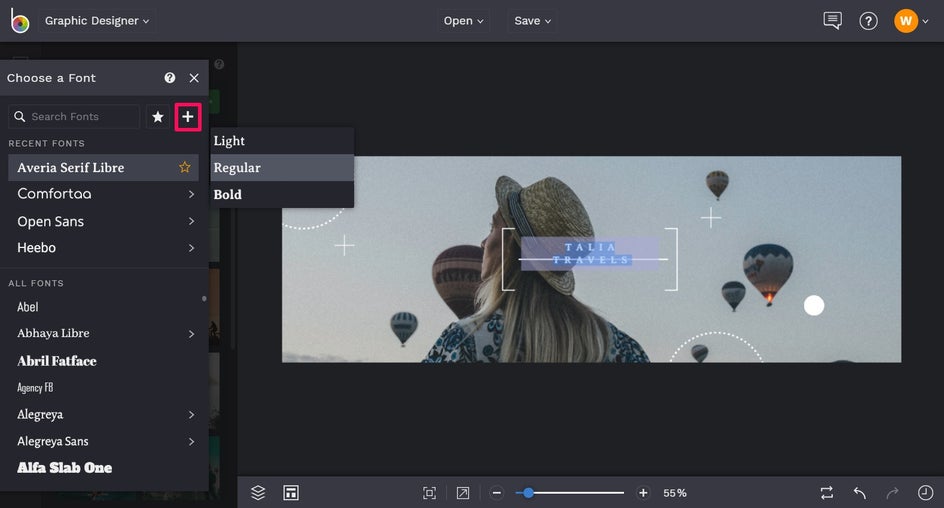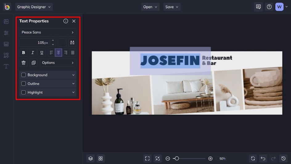 You’ll notice that when you select a text box, a Text Properties toolbar appears. From here, you can change the font of your text by selecting one from BeFunky’s library. Additionally, you can edit things such as font size, spacing, alignment, and more.