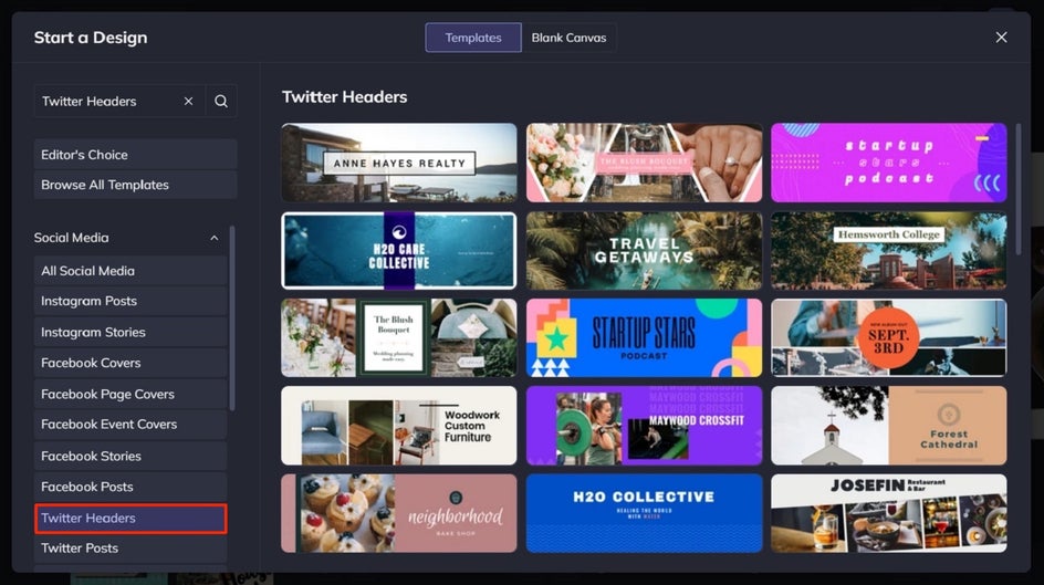 The link above will take you directly to BeFunky’s library of professionally designed Twitter Headers. Simply select a design that takes your fancy, then click Use This Template to begin.