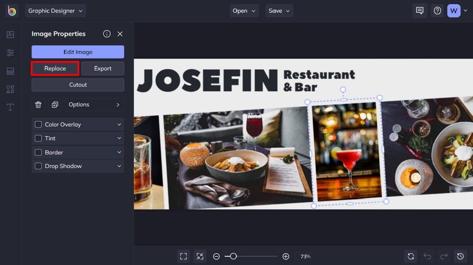 First up, we’re going to swap out the template’s existing image or images for ones representing your own personality or brand. To do this, click on the image you wish to swap, and an Image Properties toolbar appears. Click Replace to open an image from your own files.