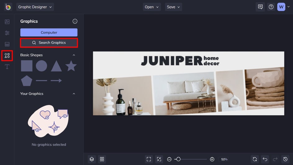 Or, if you want to insert new graphics for some extra flair, navigate to the Graphics tab and click Search Graphics to open the Graphic Library. Here, you can find symbols, shapes, lines, and so much more.