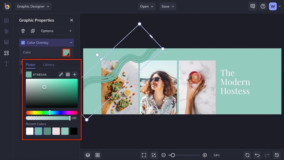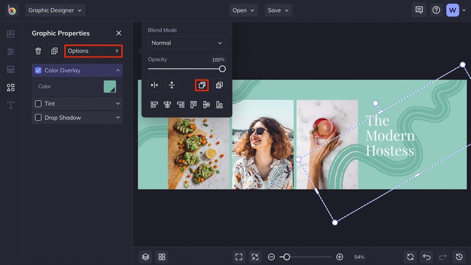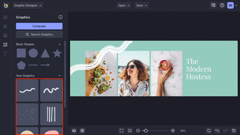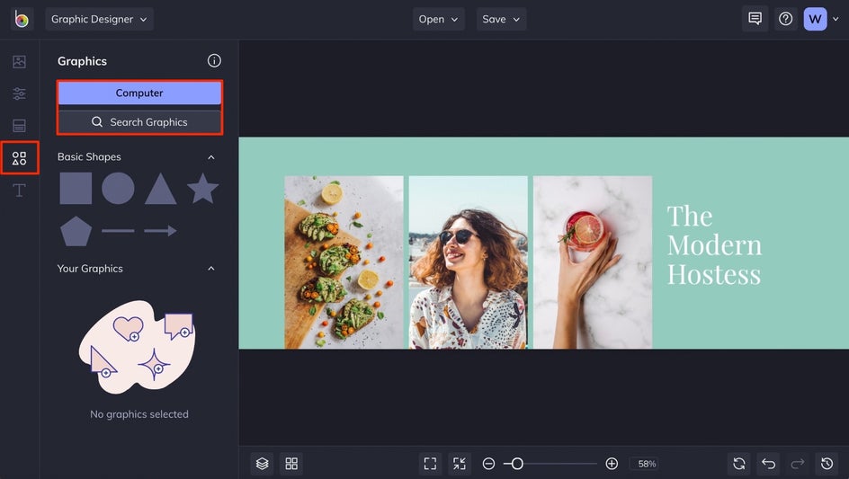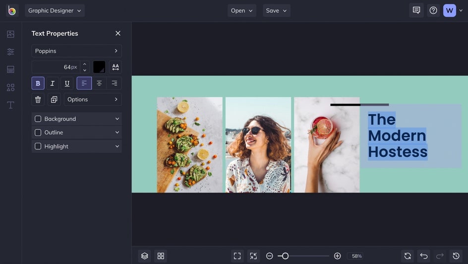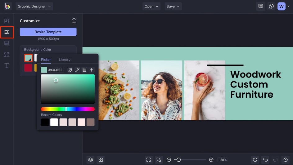 Start by uploading your own food photography or browsing the Stock Image library for vibrant placeholders. Then, use the Photo Editor to enhance color, contrast, and clarity. This is especially helpful for showcasing textures and plating.