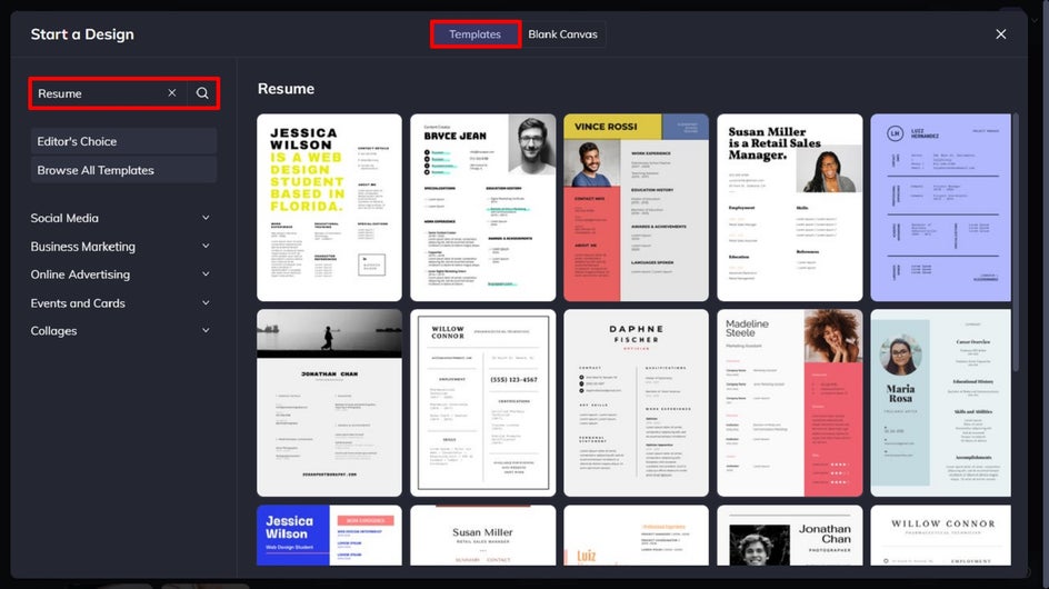 A well-designed resume is easy to read and will catch the eye of hiring managers. You can create your own from scratch, but BeFunky is home to all sorts of wonderful resume design templates that you can quickly customize with your own information. You’ll find them in the Graphic Designer’s Template Library. Just search “Resume” in the search bar to locate them.