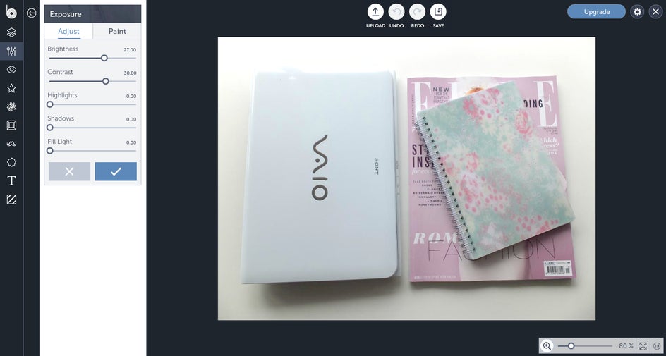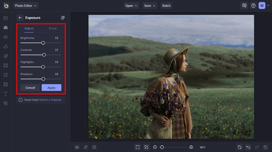 Click on Edit in the main menu on the left, then locate Exposure. This tool lets you alter the Brightness, Contrast, Highlights, and Shadows of your image, each of which contributes to its overall exposure.