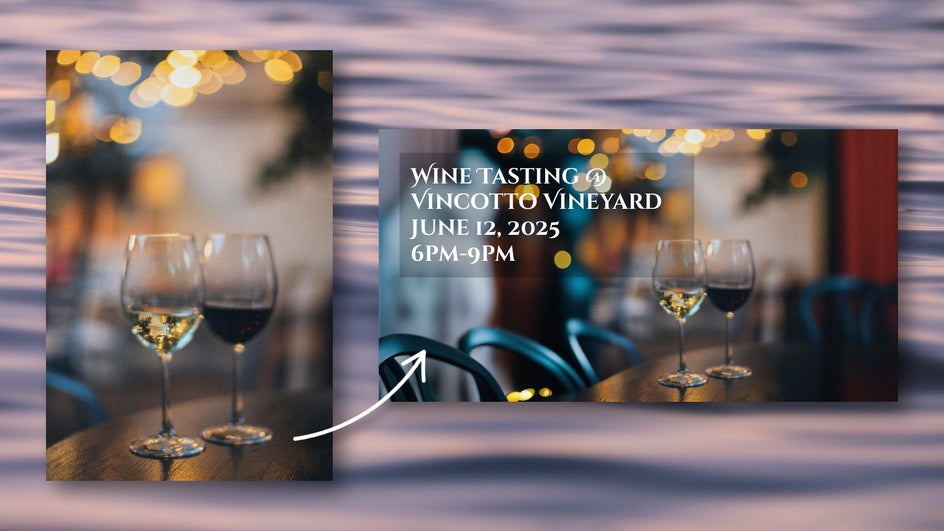 Need a Facebook event cover photo but only have tightly framed shots or vertical images? Expand intuitively generates more room around your central image, perfecting your event covers without distorting important visual elements or causing uncomfortable cropping. This example expands an image for a wine tasting event.