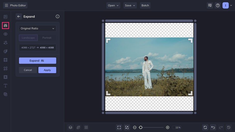 Upload your photo directly into the Expand tool, or access Expand AI from the Photo Editor’s Edit tab. You'll notice your current photo dimensions displayed on the canvas.