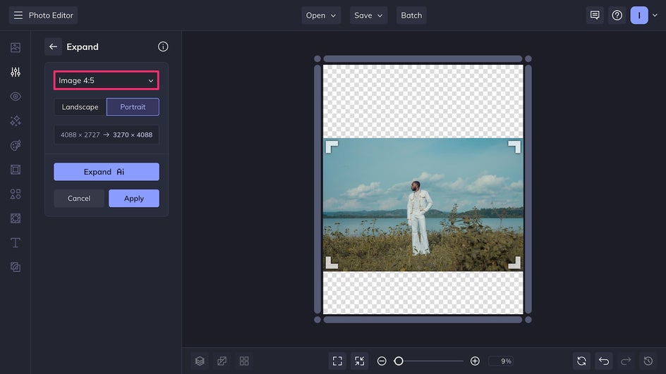 Enter the AI Image Extender: A simple but powerful AI tool designed to expand your photo canvas by creating additional realistic background content. Unlike traditional cropping, which can lead to awkward compositions and cut-off subjects, the Expand tool doesn’t cut anything out. Rather, it makes your photos bigger by generating realistic backgrounds around your original image. Simply input your desired aspect ratio and the AI software will analyze your image, produce a new background based on context, and seamlessly blend these new elements into your initial photo.