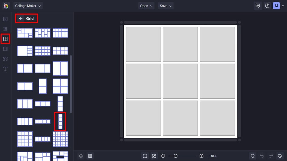 Navigate to Layouts in the main menu on the left, followed by Grid. Scroll down to select the layout featuring four vertical cells.