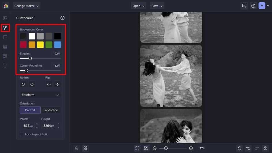 Next, you can change the background color of your film strip, as well as elements such as corner rounding, by navigating to Customize in the main menu. Adjust the spacers underneath Spacing and Corner Rounding to increase or decrease these elements. Additionally, you can select a background color from the existing color swatches, or click on the first swatch to choose your own color from the Color Picker. Here, we’ve used the Eye Dropper Tool to select a hue already present in our images.