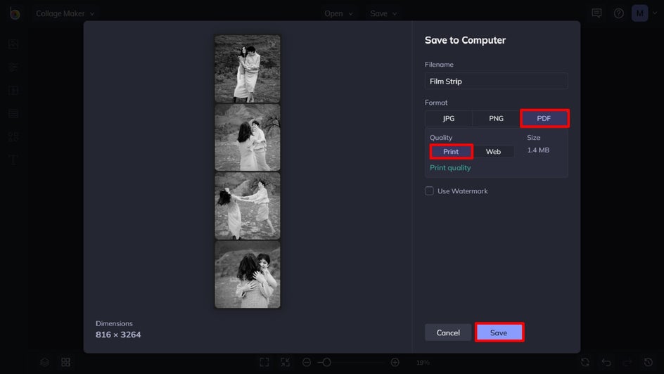 If you want to print your photo film strip, we recommend saving your image as PDF format in Print quality. This will give you the highest quality file that’s perfect for printing.