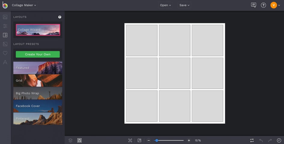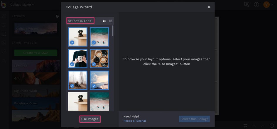 Once uploaded, navigate to the Layouts section. We recommend then going to the Collage Wizard tool. This tool will allow you to load in all the images that you’d like to include in your vision board and give you a variety of different layout options to display the photos.