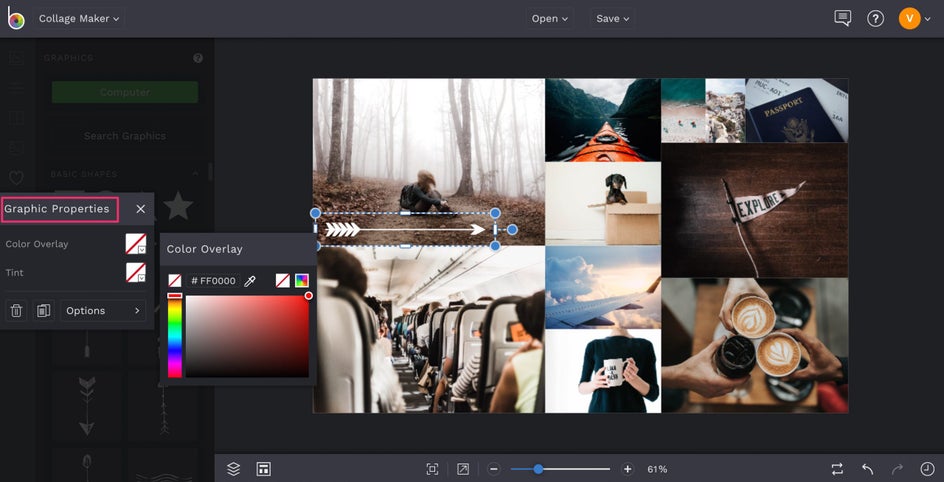 Once the graphics have loaded into your Graphics Library, you can drag and drop them on to your vision board. You can change the size and color of the graphics by using the Graphic Properties menu