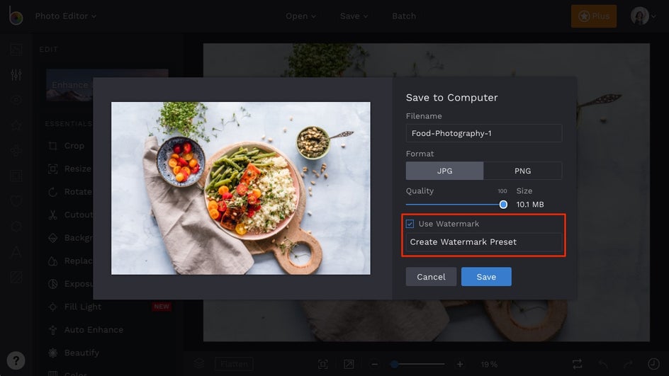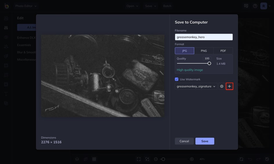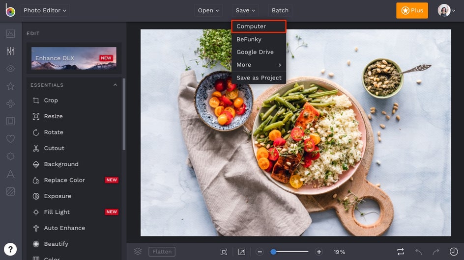 Adding a watermark will be the final step in your workflow. After you are finished editing your photo, click the Save button, followed by Computer or BeFunky.