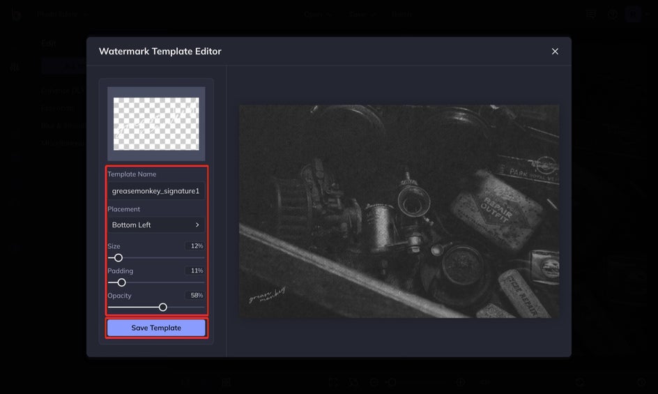 After uploading your watermark, it will automatically be placed on your photo as a preview. This is your chance to customize the size, padding, opacity, and placement.