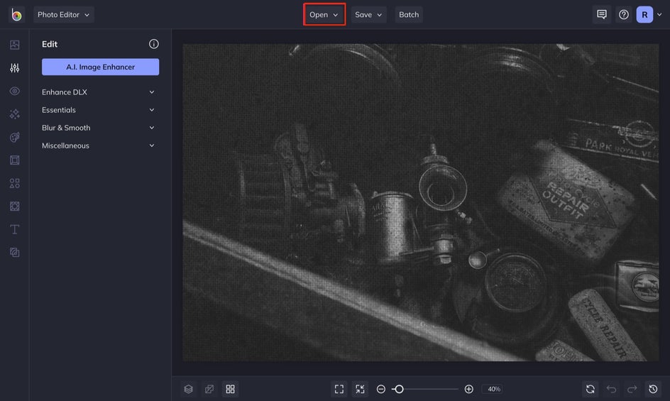 For this tutorial, we're going to head to the Photo Editor. To upload your photo, click on the Open tab, or simply drag-and-drop an image directly onto the interface.