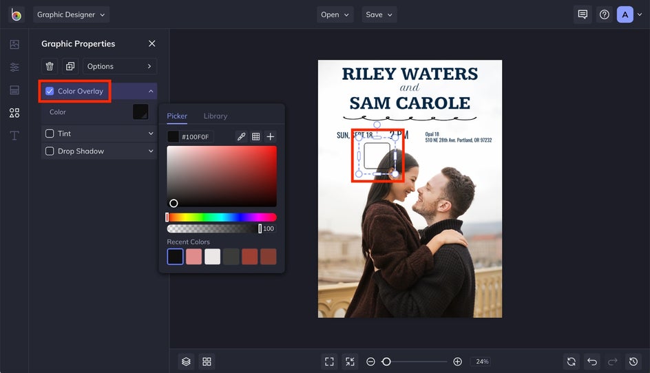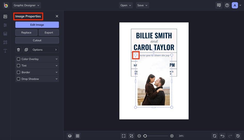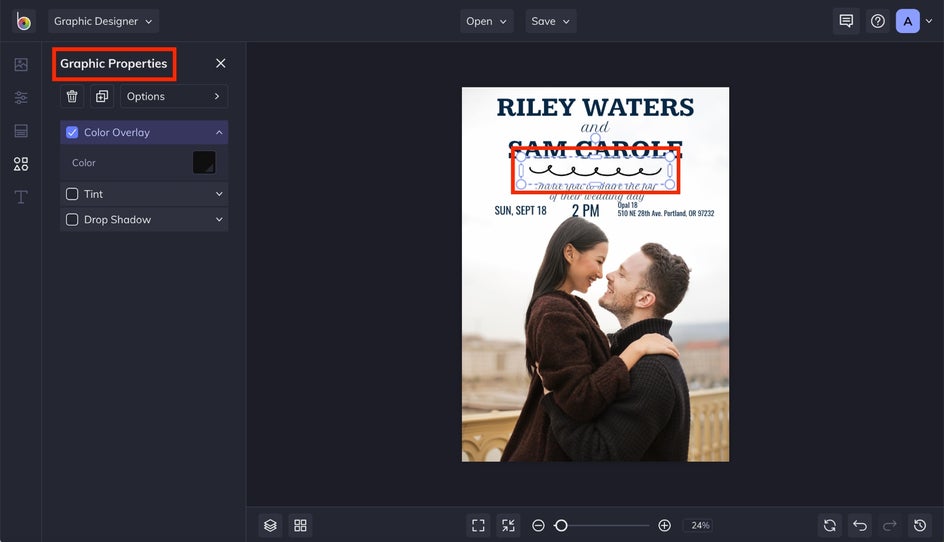 To make the most of a photo-forward design, choose a layout that gives the image room to breathe. Think clean lines, minimal text, and complementary colors. You might even consider keeping the messaging short and sweet so your photo takes center stage. Finally, you can utilize our photo editing tools to match your wedding’s color palette or vibe – whether that’s by adding a black and white filter, retro effect, or even an Artsy style.