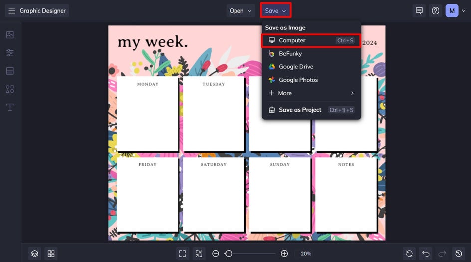 Once your one-week calendar design is complete, it’s time to save your file so it can be printed and filled in. Click Save, followed by Computer.