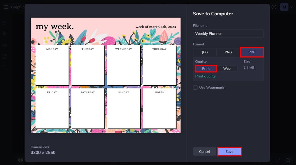 Step 6: Save Your 7-Day Weekly Planner as a Printable PDF