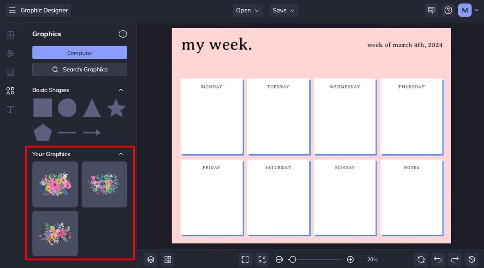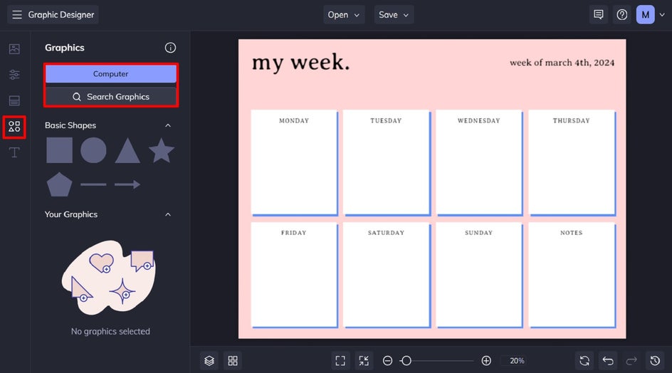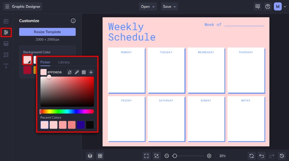Ready to make your own printable weekly planner? To get started, head to the Graphic Designer, then follow these 6 simple steps below.
