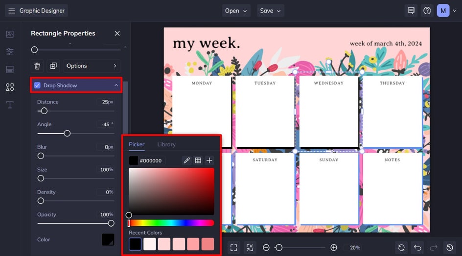 You can also change the colors of your template’s existing or new graphics, if you wish. To do so, just click on the graphic you wish to change, and a Graphic Properties panel appears. In this example, we’re changing the drop shadow color so it’s consistent with our black text.