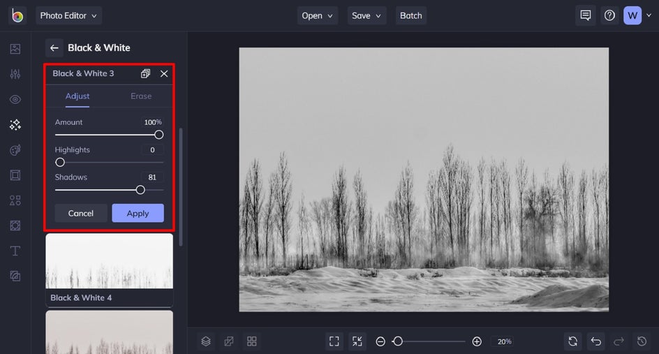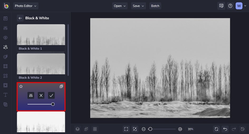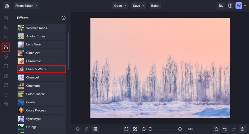 Winter weather is typically gloomy by nature, so adding a Black and White effect can add drama and make the scene look more compelling. To do this, head to the Photo Editor and open the photo you wish to edit.