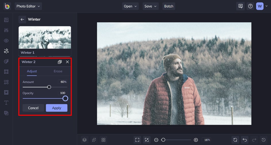 Within the Winter effects category, click Winter 2. You’ll notice when you click on an effect, three options are available: Settings, which allows you to alter the effect further; Cancel, which cancels the selected effect; and Apply, which applies the effect as-is. You can also adjust the strength of the effect using the slider.