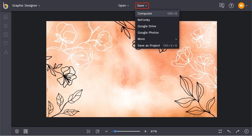 Once you’ve finished creating your custom Zoom background, click Save at the top of the screen to save it to your Computer, Dropbox, or more so it’s ready to upload into Zoom.