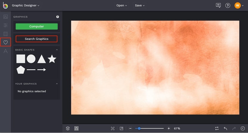 Next, we’re going to add graphic elements to bring our custom Zoom background to life. Click on the Graphics tab in the main menu on the left, followed by Search Graphics.