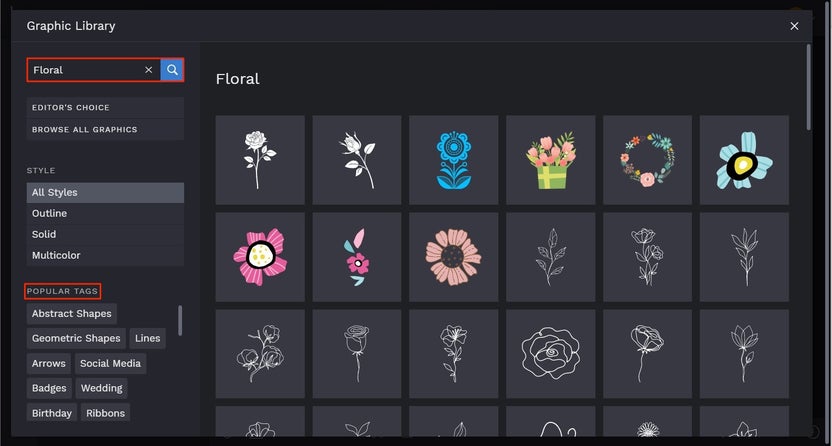 Here, you'll be able to search our huge library of shapes, symbols, lines, and so much more. Just type in a search term of your choice or search by Popular Tags.