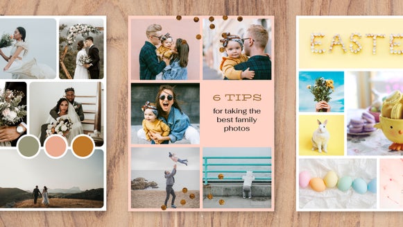 No nosso Assistente de Colagem on-line você encontra uma ampla seleção de layouts personalizáveis de colagem de fotos para preencher com suas fotos. De grades de fotos a colagens de capas para o Facebook e pins para o Pinterest, temos um layout para cada necessidade!