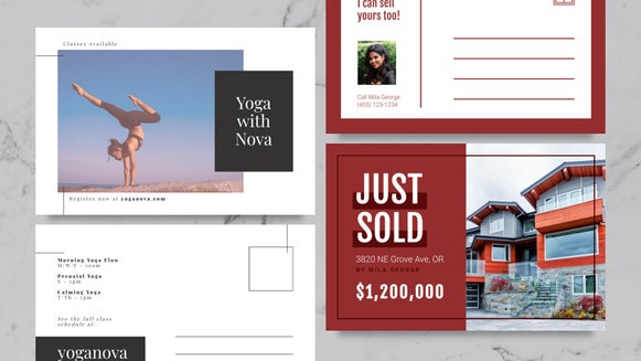 Crie os cartões-postais perfeitos para todas as suas necessidades de mail marketing direto. Nossos modelos de cartões-postais possuem design dupla-face em diversos layouts para o ramo imobiliário, marketing de eventos e muito mais!